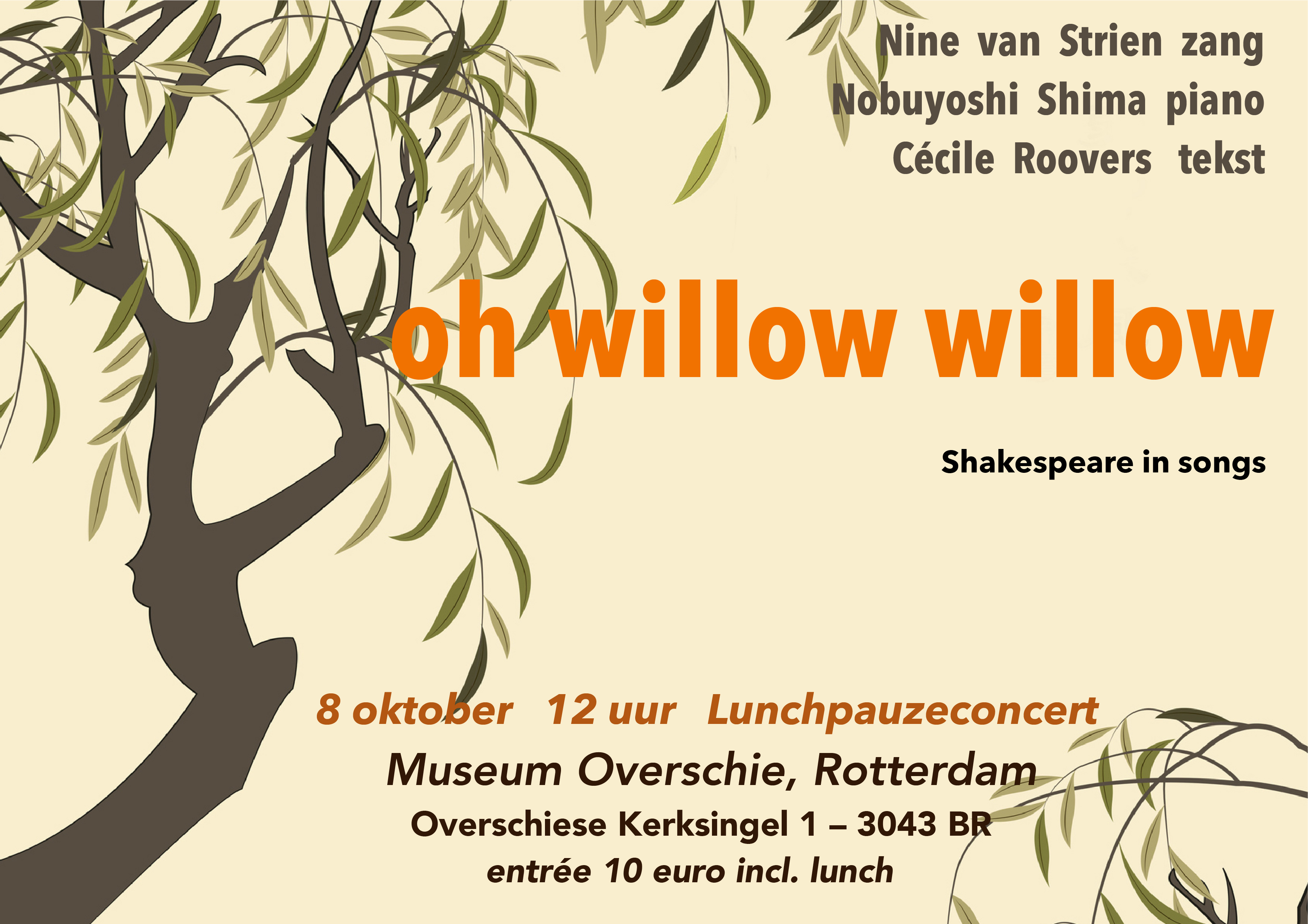 Kaartjes verkrijgbaar via: https://www.eventbrite.nl/e/tickets-lunchconcert-oh-willow-willow-shakespeare-in-songs-703299356307?aff=oddtdtcreator
